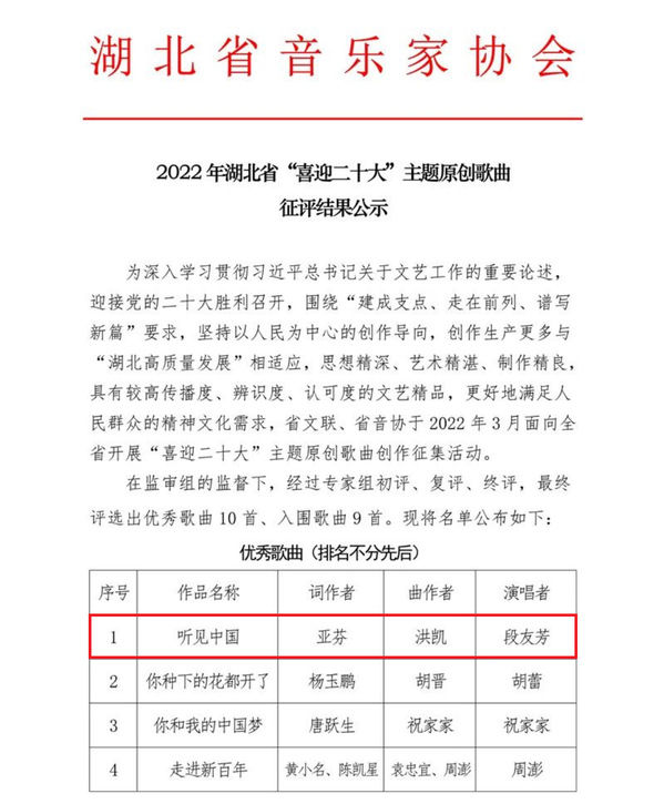 本网讯 9月22日,由湖北省文学艺术界联合会、湖北省音乐家协会联合开展的“喜迎二十大”主题原创歌曲创作征集活动圆满落下帷幕。我校音乐与戏剧学院、黄梅戏学院段友芳教授演唱的原创歌曲《听见中国》入选优秀歌曲。