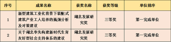 本网讯 近日,2020-2021年度湖北优秀调研成果和发展研究奖拟获奖成果公示,我校建筑工程学院周永团队的《新型建筑工业化背景下装配式建筑产业工人培养的瓶颈分析及对策建议》和地理与旅游学院江砥团队的《关于湖北率先构建新时代生育友好型社会支持体系的建议》荣获三等奖。