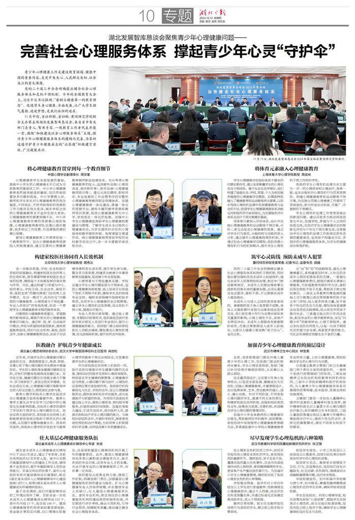 《湖北日报》2024年12月12日第10版以《完善社会心理服务体系撑起青少年心灵“防护伞”》为题,专题报道了我校与湖北省社科联、湖北省妇联联合主办的以“加快健全社会心理服务体系”为主题的湖北发展智库恳谈会。会上,专家学者绕“加快建设社会心理服务体系”主题,探讨青少年心理健康服务体系的建构与完善,为答好这道守护青少年健康成长的“答题”积极建言资政、广泛凝聚共识。